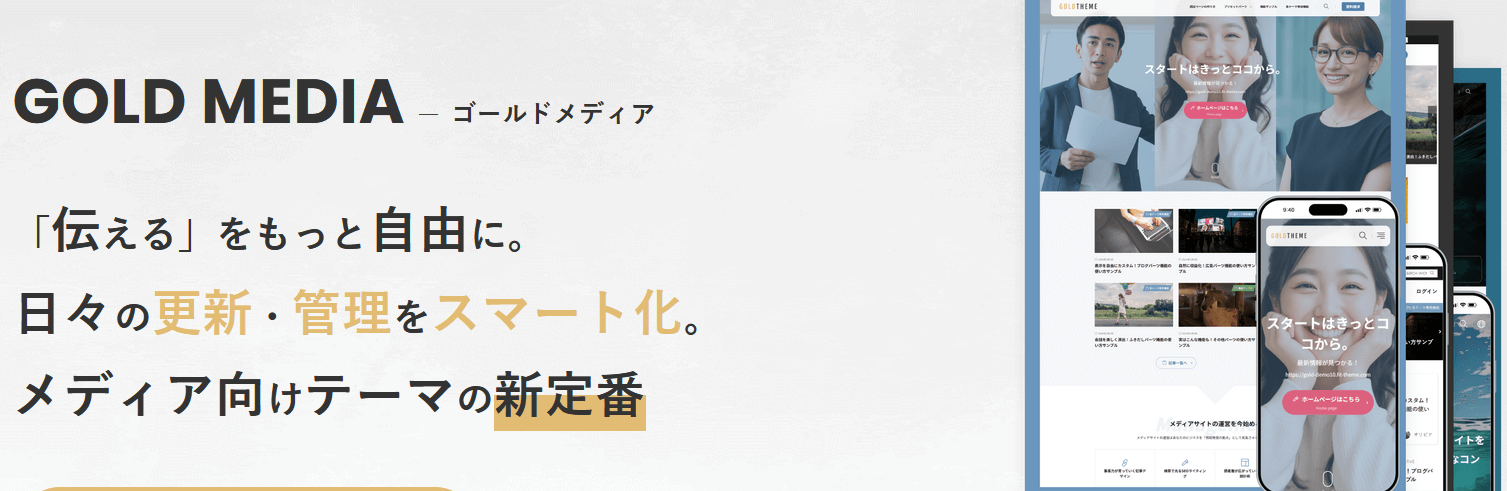 GOLD MEDIAは、「直感操作で美しく」「SEOに強く」「安心サポート付き」の三拍子揃った、メディア運営に最適なWordPressテーマです。